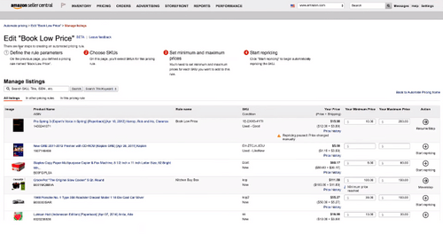 Amazon's Automate Pricing is a tool for Amazon sellers that allows them to automatically reprice their products to match a certain criteria they set. For example, a seller could use the tool to set their product's price to always be 2% above the lowest price offered or to match it. Below is an image of the original interface for Automate Pricing.